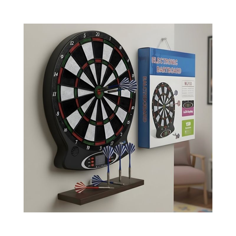 Electronic dart board with automatic scoring display, perfect for indoor entertainment. Ideal for family fun, parties, and friendly competitions.