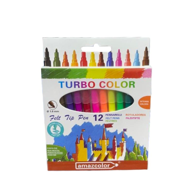 The Amazcolor Turbo Color Felt Tip Pen Set includes 12 vibrant markers with 1.8mm tips, perfect for bold coloring and detailed artwork. Featuring intense colors, long-lasting ink, and an extra-long cap-off time, these pens are ideal for kids and artists alike who love smooth, expressive drawing.